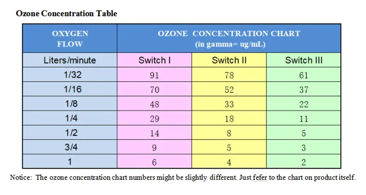 Concentrações do ozono 2 ~ 91 ug/mL ( 1 ug/mL = 1 gamma = 1 mg/L) Ajustável